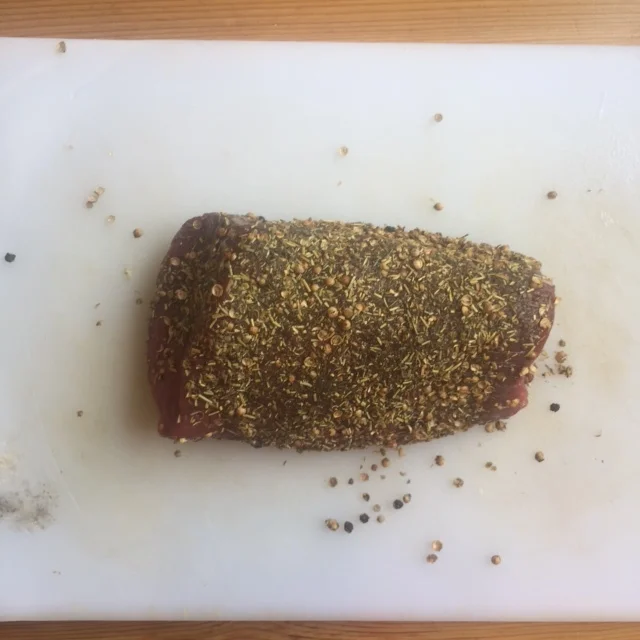 Roll your fillet of beef in the mix, and in a hot pan sear the beef for roughly 5 minutes on each side. Drizzle a bit of olive oil into the pan before you get going with this.