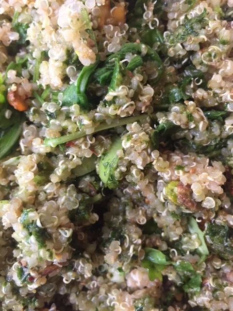 Place your rocket, broccoli, spring onions and toasted pistachios into a serving bowl, add your drained couscous or quinoa, the herb paste, and mix well. As a finishing touch add your onions and serve with a quick squeeze of lemon